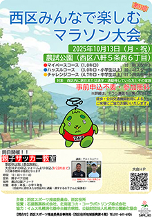 西区では、区民の体力・健康増進及びスポーツの振興、地域住民相互の連携と親睦を深めることを目的に、昭和50年から毎年、10月の「スポーツの日」(旧:体育の日)にあわせて、「西区みんなで楽しむマラソン大会」を開催しています。